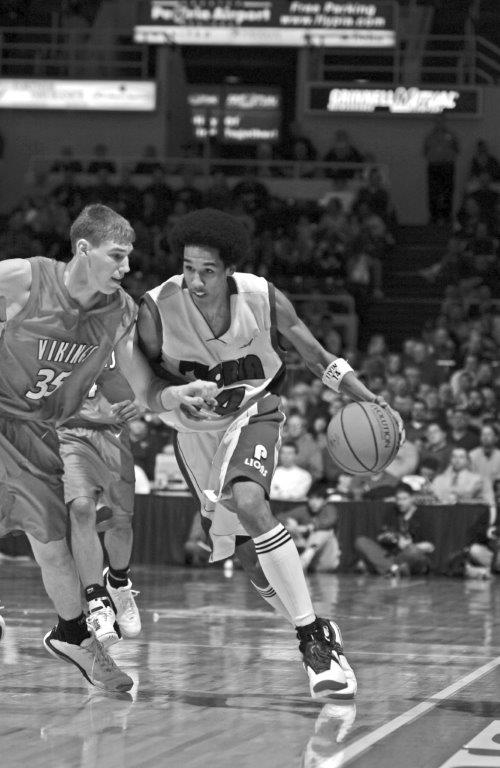 Peoria Central’s Shaun Livingston flirts with the sideline as he drives upcourt against Brian Nussbaum of Homewood-Flossmoor.